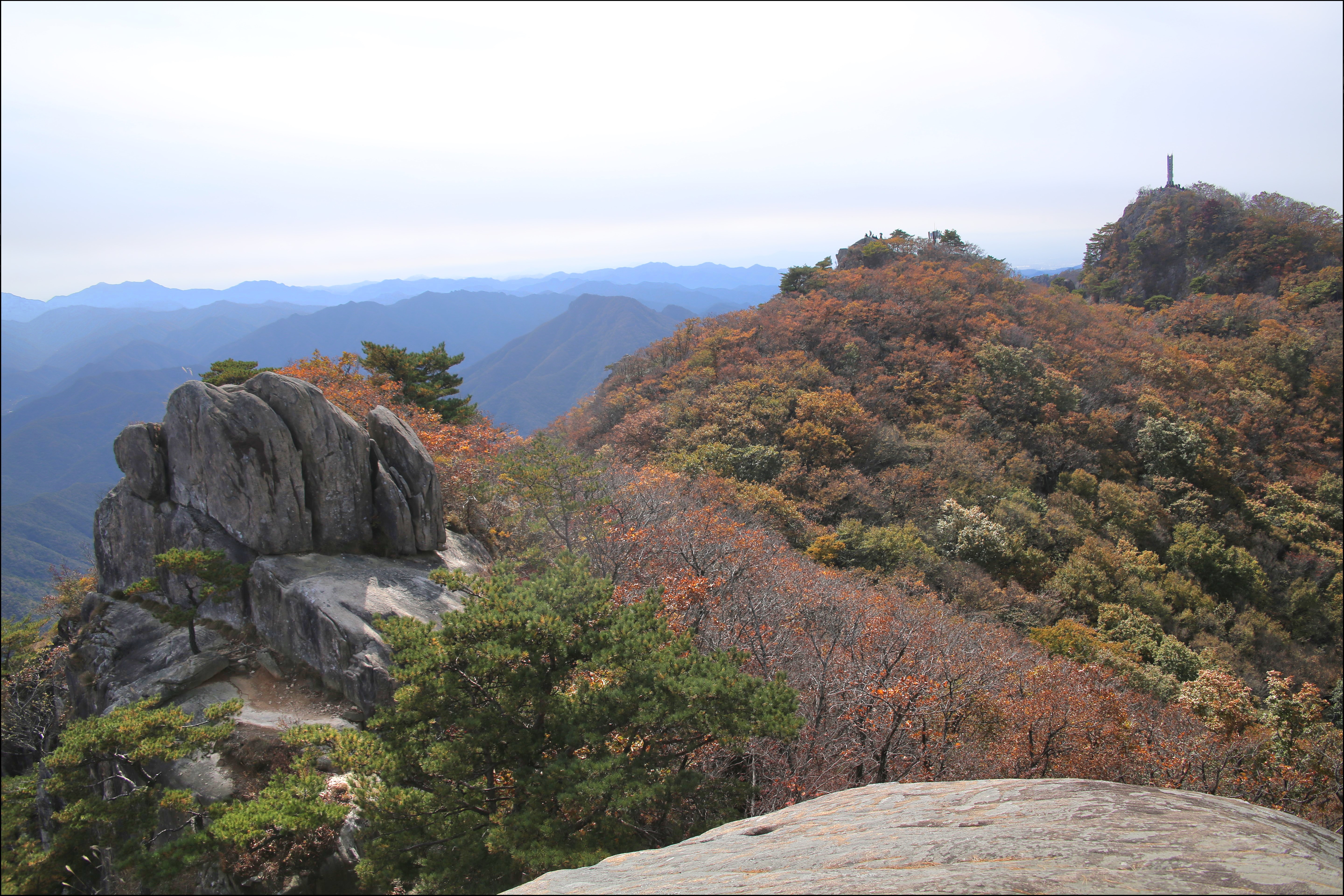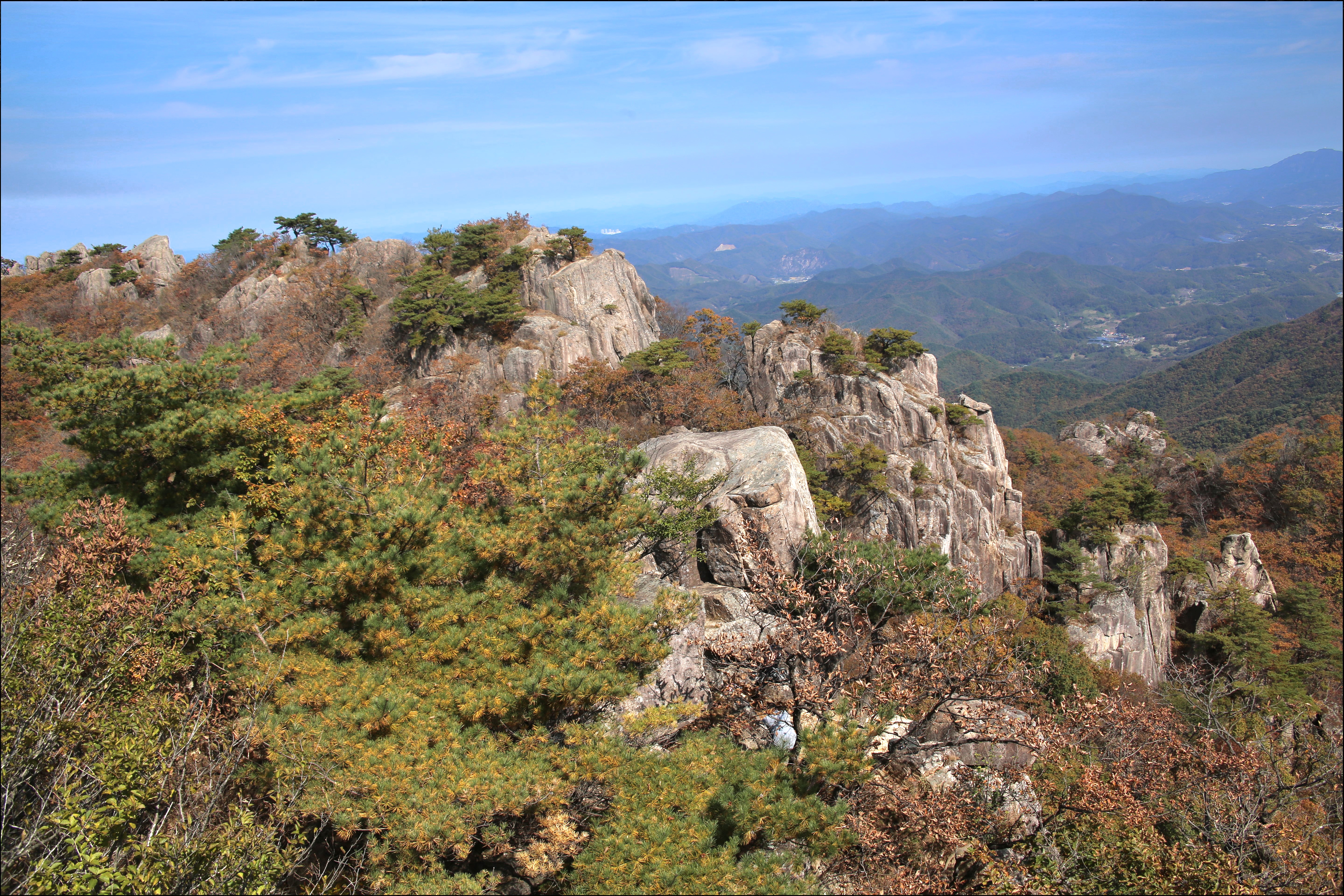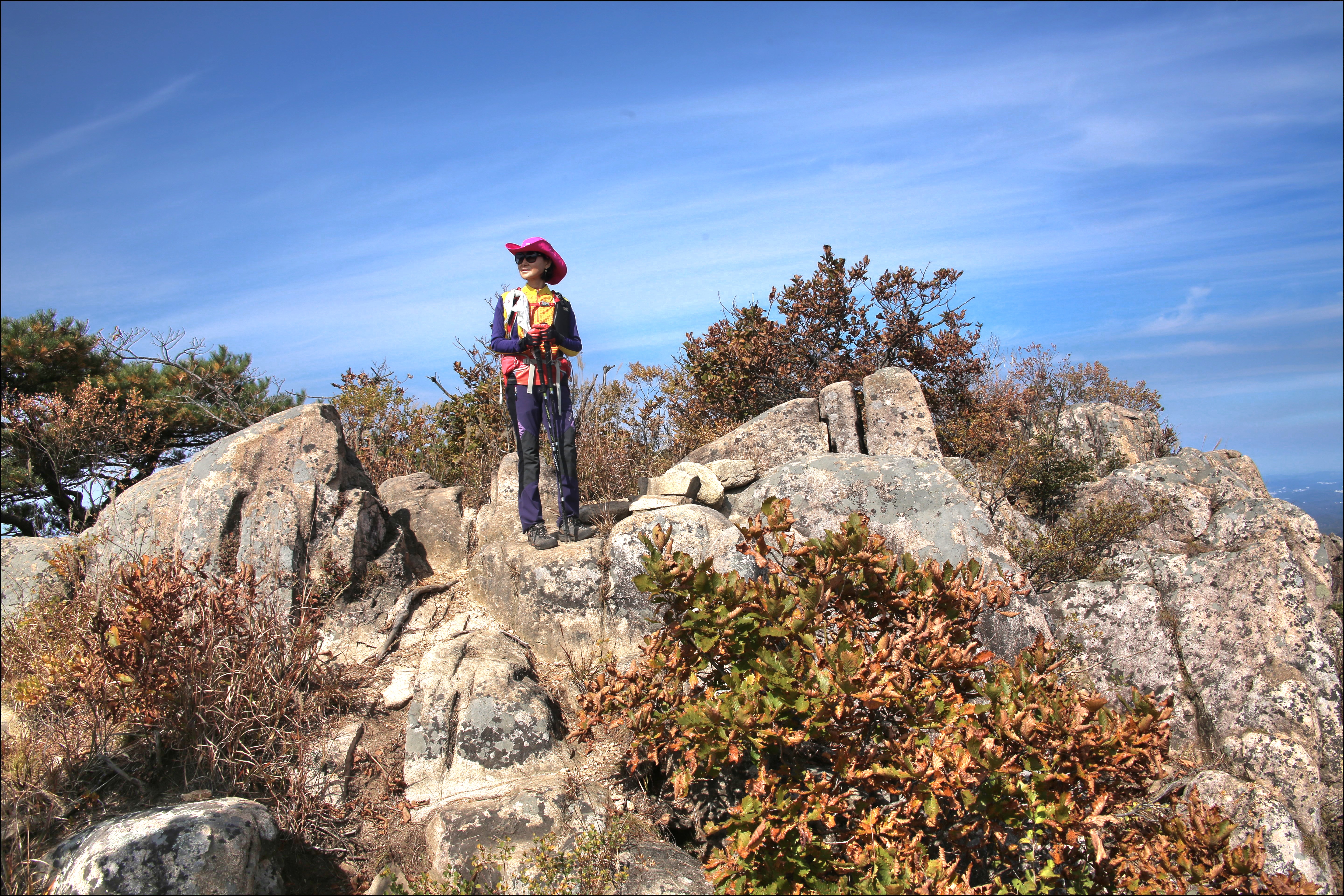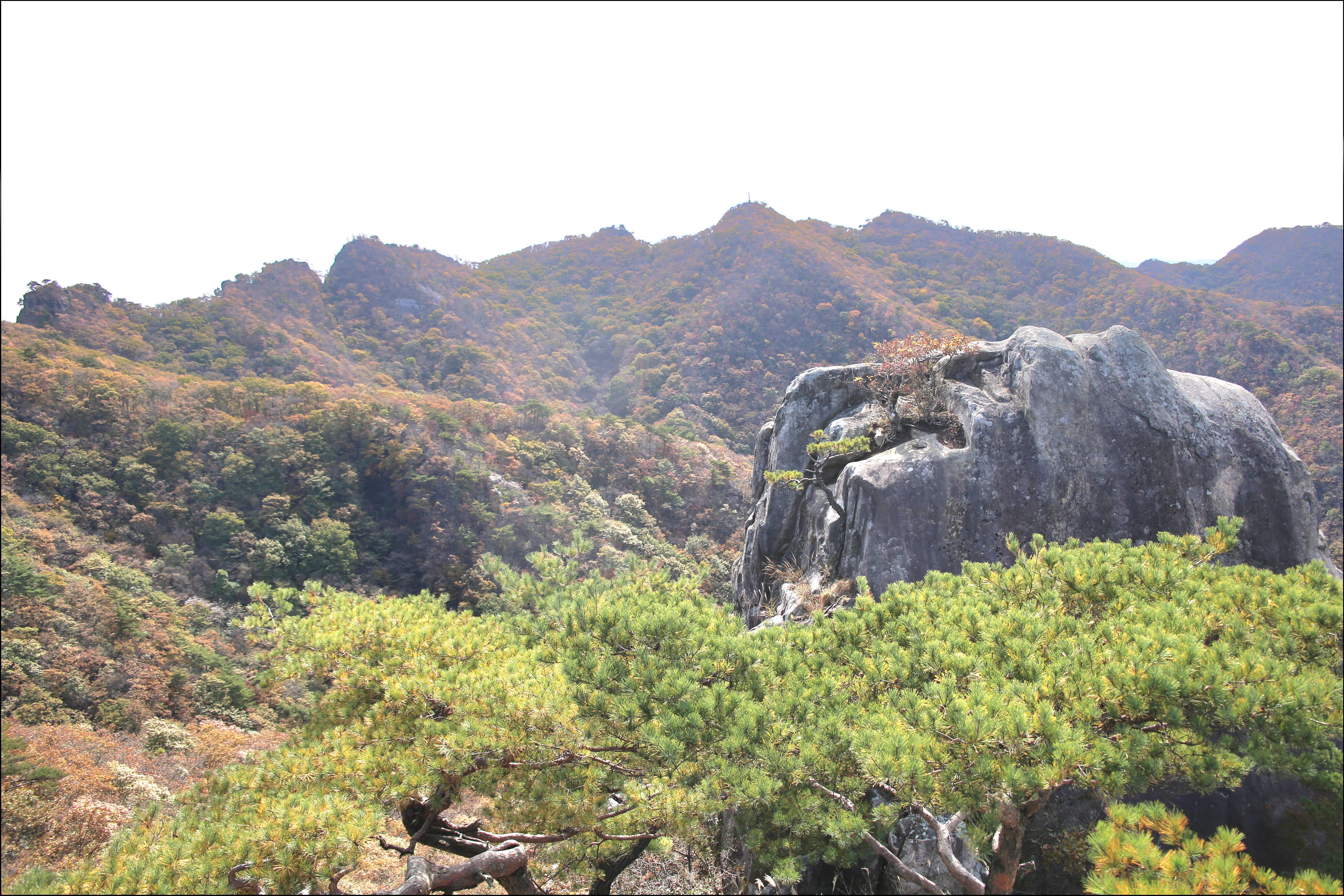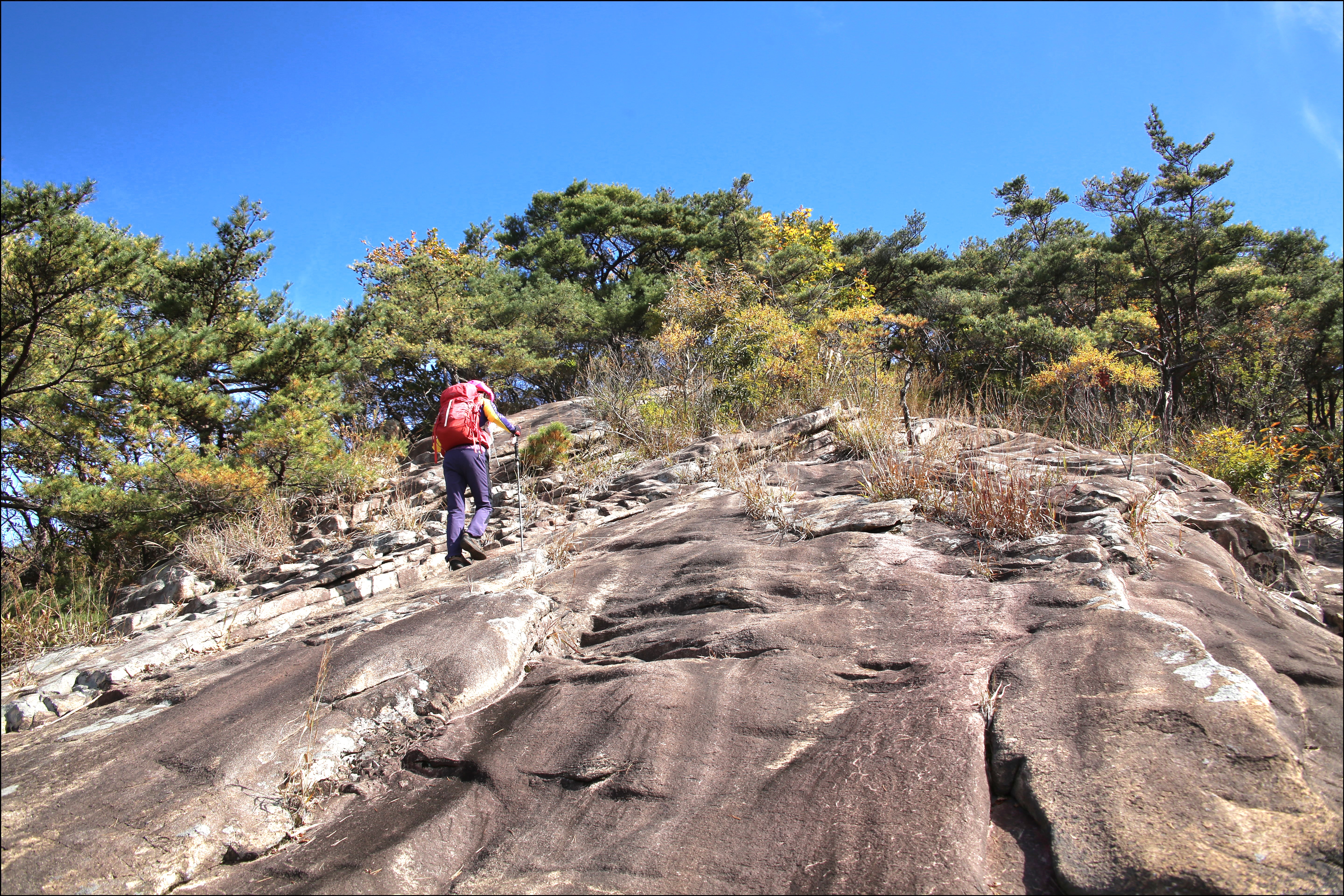 슬그머니 들어가 주변 풍경을 살피니 7경으로 선정될만큼 좋은 조망처에 위치하였지만 탐방객이 머무를만한 공간이 없을 정도로 협소하였기에 출입금지한 듯 싶었다. 미답지인 석천암 코스는 낙조대에 이르는 암릉구간에서 대둔산과 월성산 조망을 즐길 수 있었고, 조망코스로 부족함이 없었다. 낙조대 능선 초입 암릉으로 올라 칠성봉과 왕관바위로 이어지는 암릉으로 진행하였다.