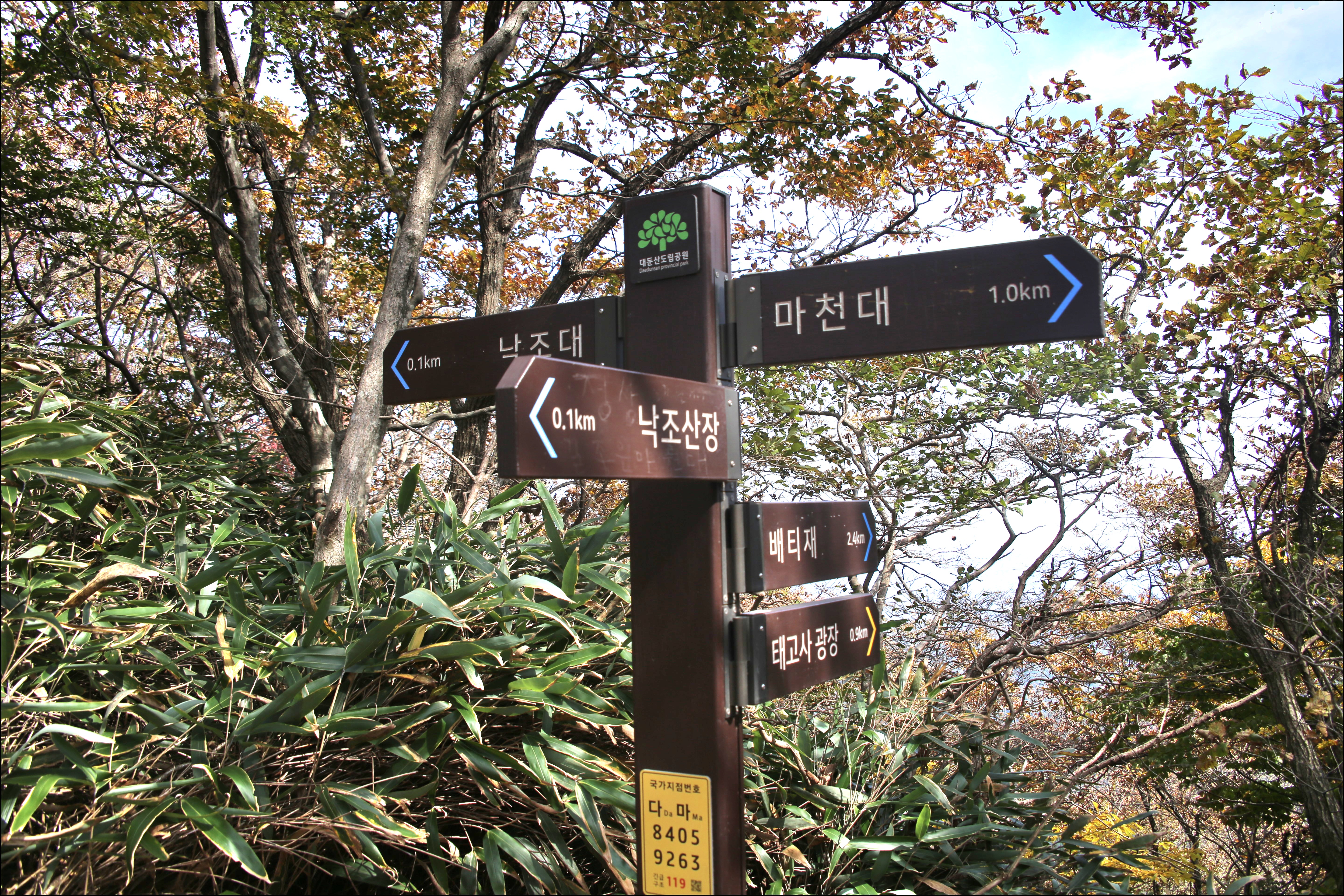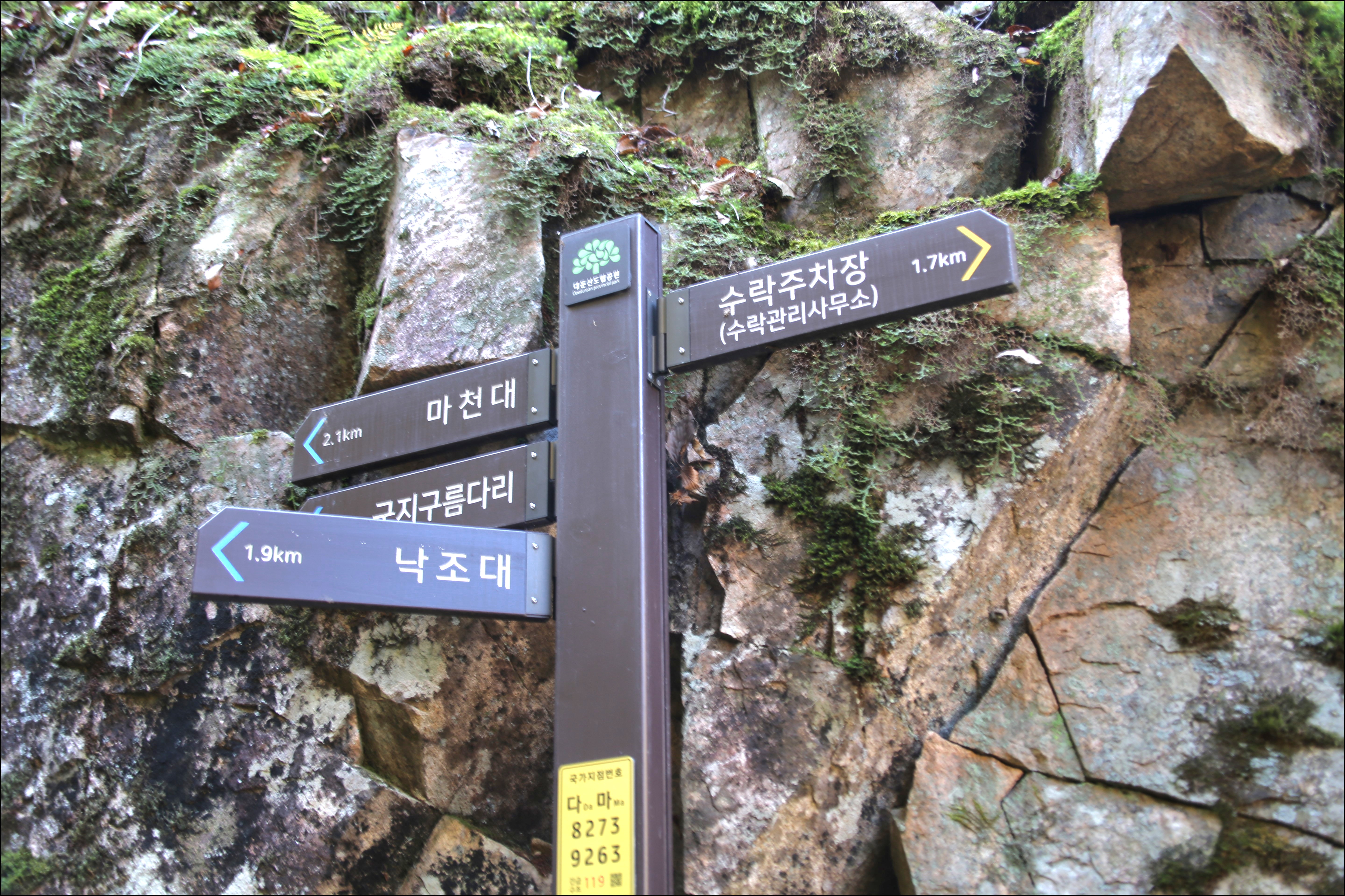 ▼수락폭포 상단 뎨크에 위치한 낙조대/마천대 분기점 이정목